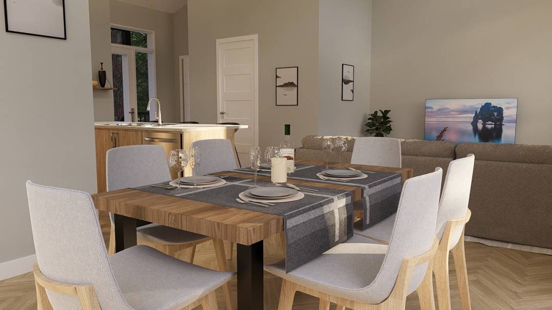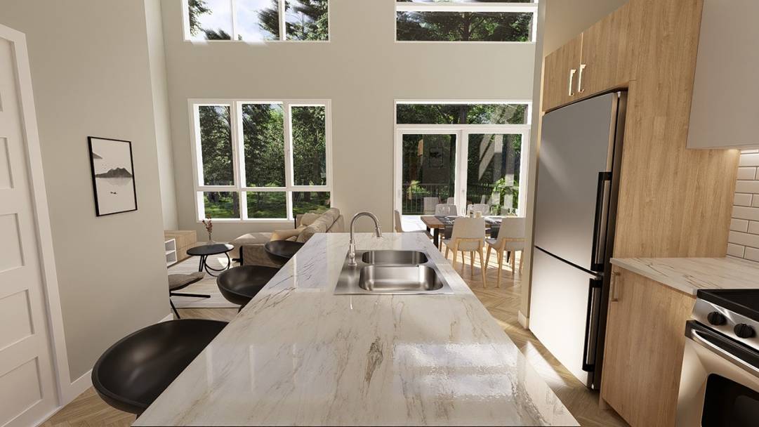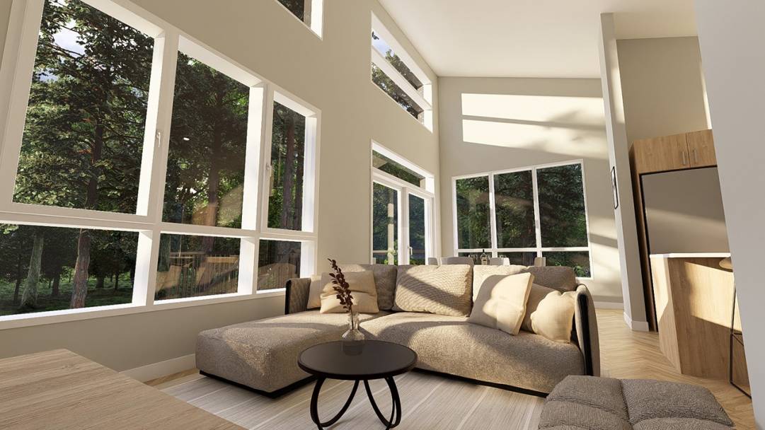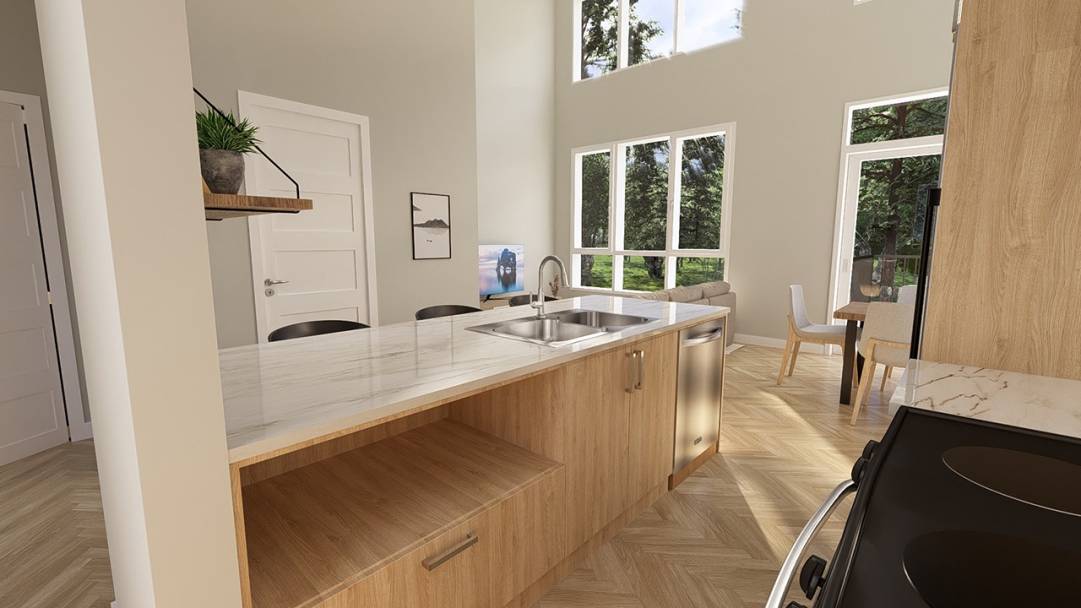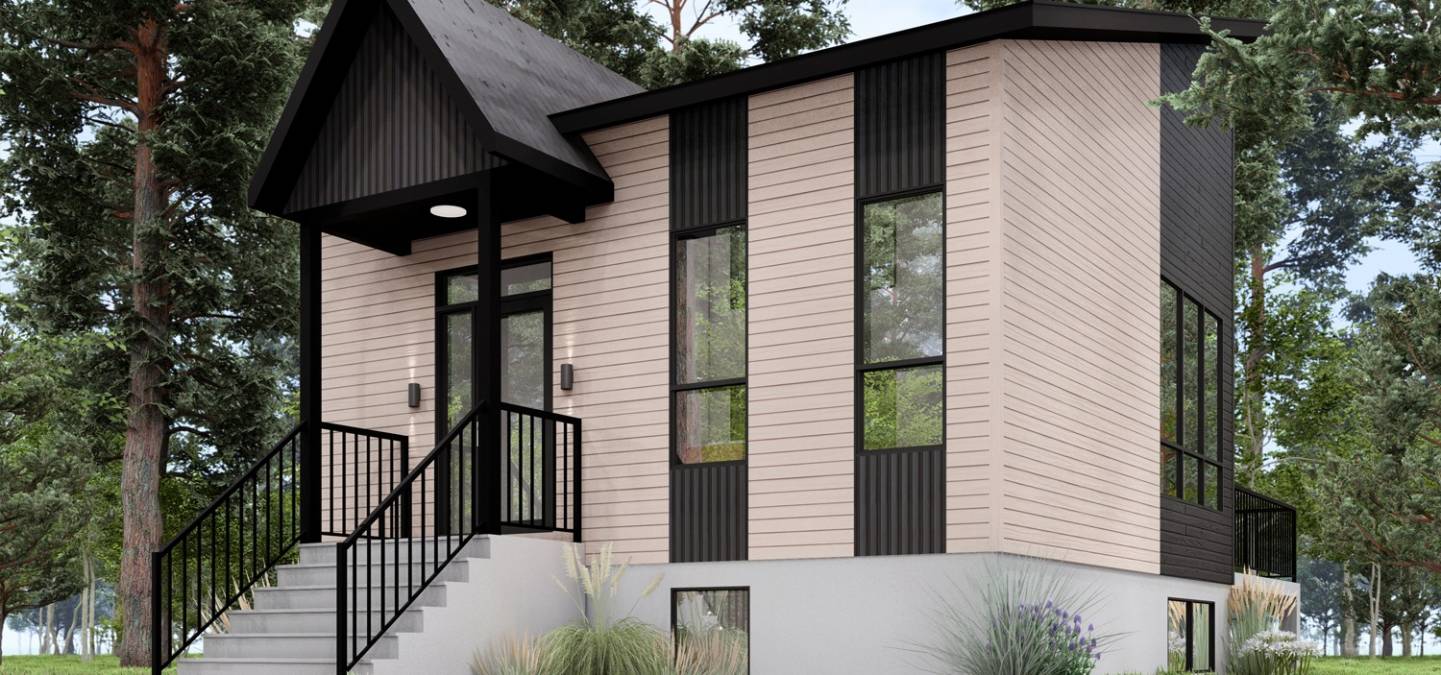 Ce modèle offre deux chambres situées au sous-sol, tandis que les espaces de vie au rez-de-chaussée bénéficient d'un plafond cathédral et d'une fenestration généreuse, inondant l'intérieur de lumière naturelle. Une terrasse couverte est disponible en option, permettant de profiter pleinement de l'extérieur en toute saison.